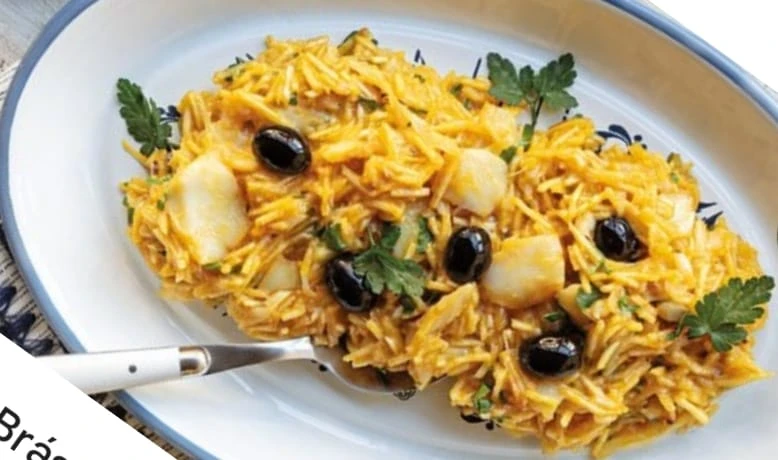 Bacalhau desfiado, cebola, dentes de alho, batata palha, ovos, salsa picada
