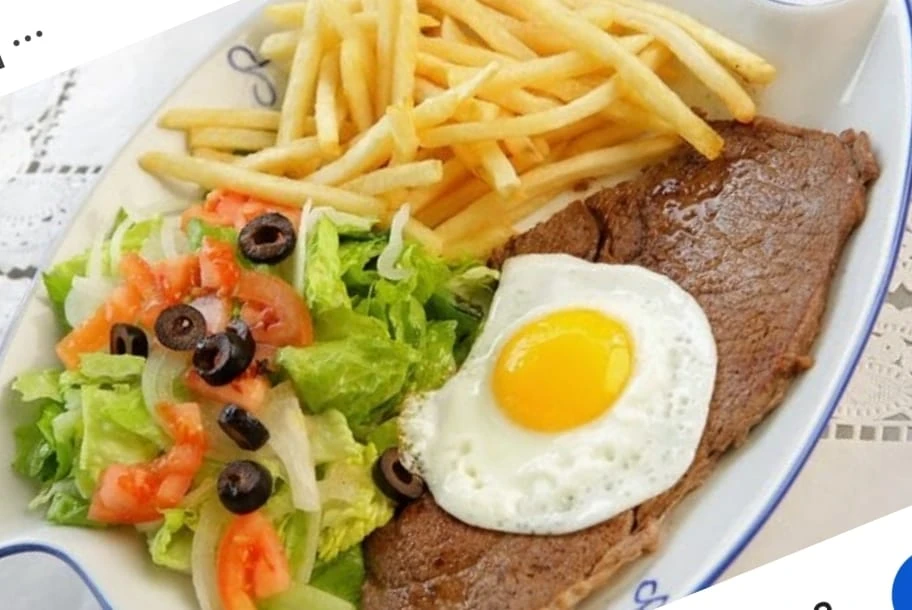 Carne (cozido com vinho e mostarda), ovos, batatas fritas, salada