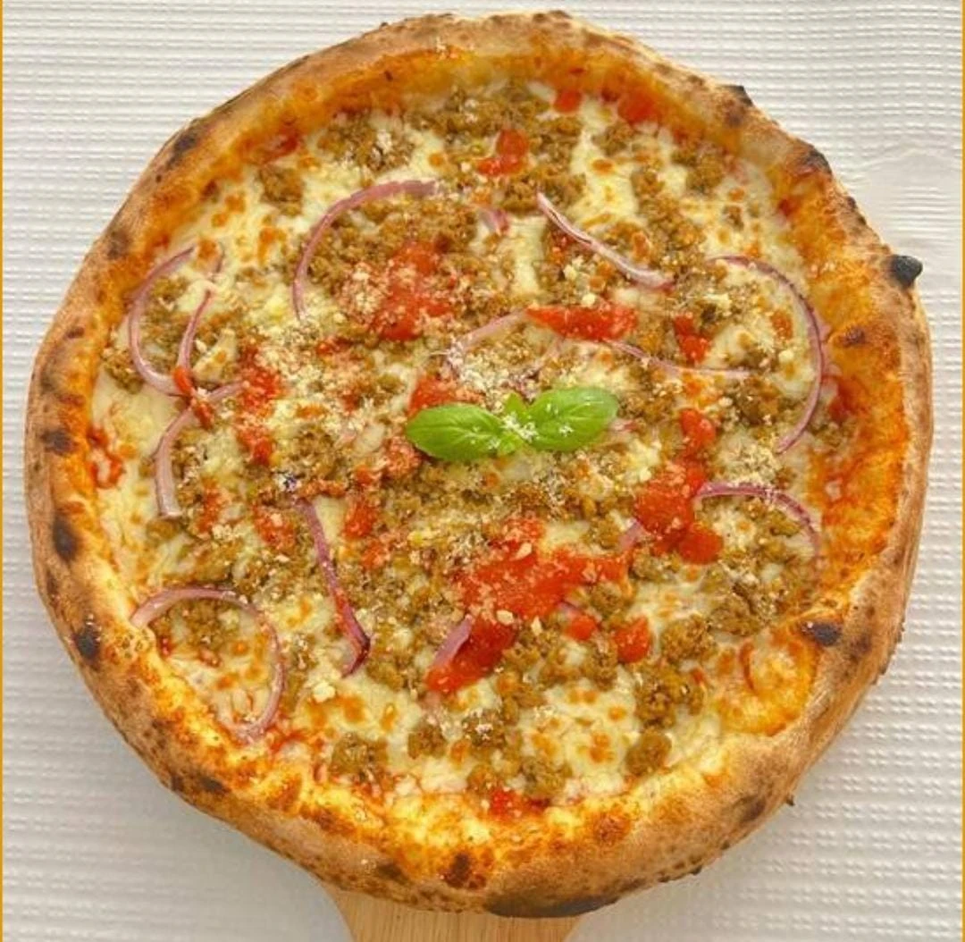 Farinha de caputo italiano, molho de pomodoro, mozzarella 100%, bolonhesa, cebola roxa e orégão